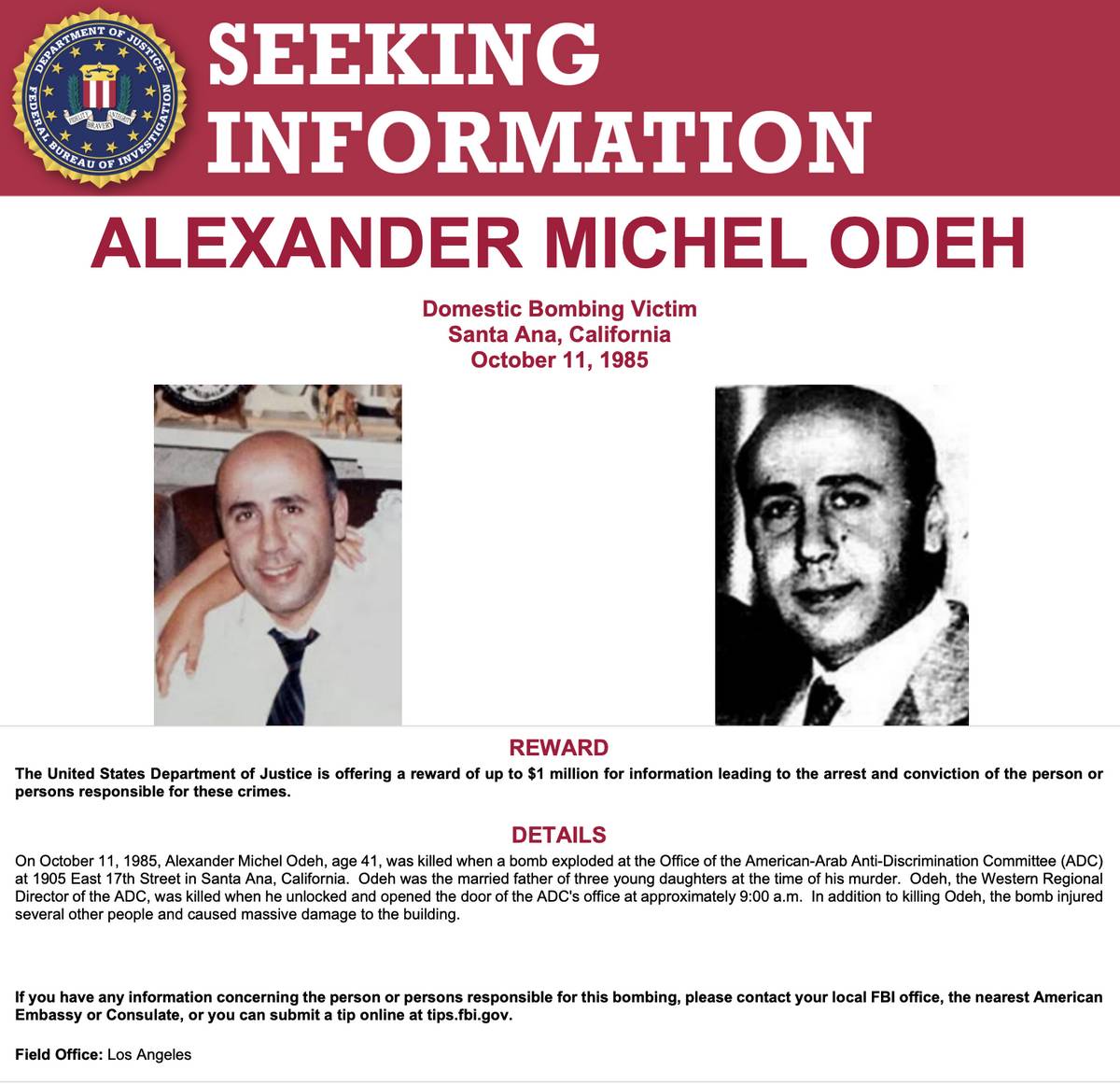 Odeh was killed when a bomb detonated as he opened the door to ADC’s Santa Ana office on October 11, 1985. The case remains open. The FBI has reiterated its public appeal for information from anyone who may have knowledge relevant to the investigation. Members of the public can contact the FBI at 1-800-CALL-FBI (1-800-225-5324).