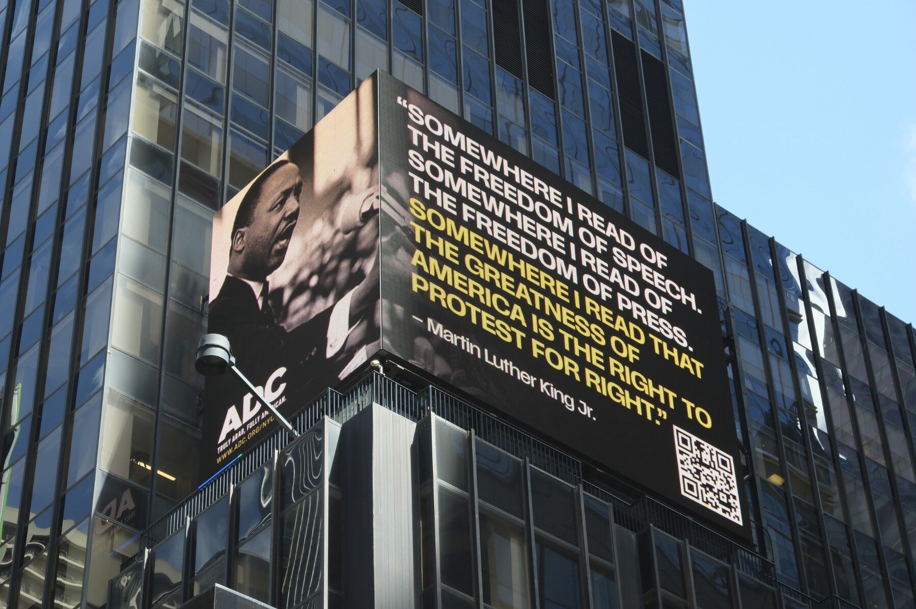 Billboard quoting Dr. Martin Luther King, Jr in response to Administration’s attacks on freedom of speech and right to dissent.