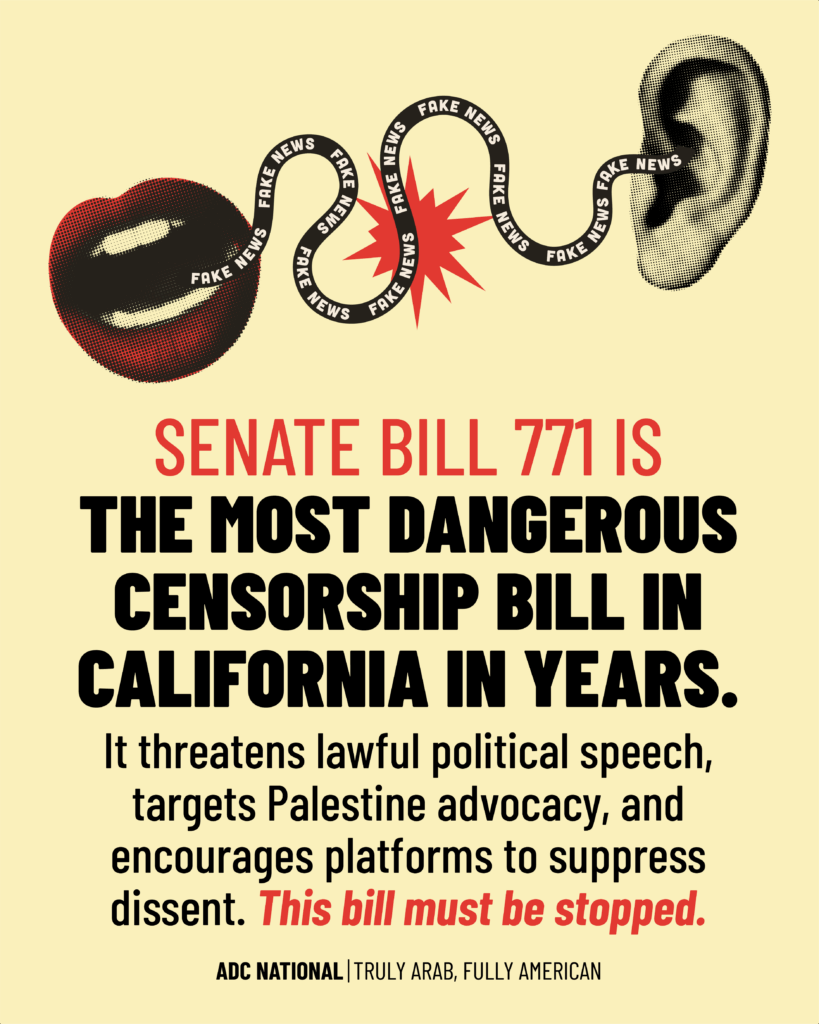 Senate Bill 771 is one of the most dangerous censorship bills in California’s recent history. Disguised as an anti-hate measure, it opens the door for government overreach, financial penalties, and algorithmic suppression of political content, especially content supporting Palestinian rights. This page serves as ADC’s central hub for advocacy resources, background analysis, and organizing tools to fight SB 771. Whether you’re an individual, educator, or organization, use this toolkit to take action, spread the word, and protect our right to speak freely.